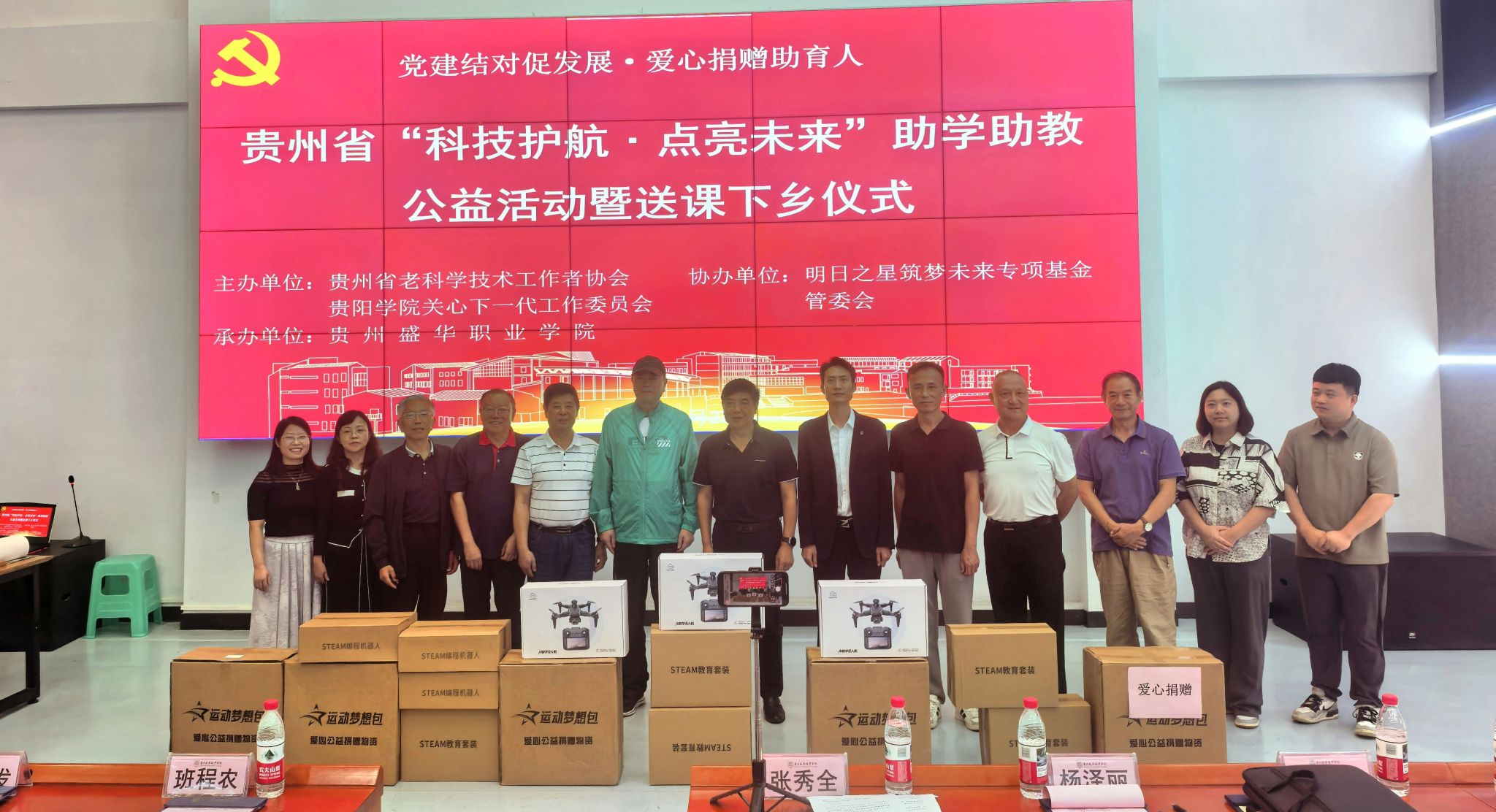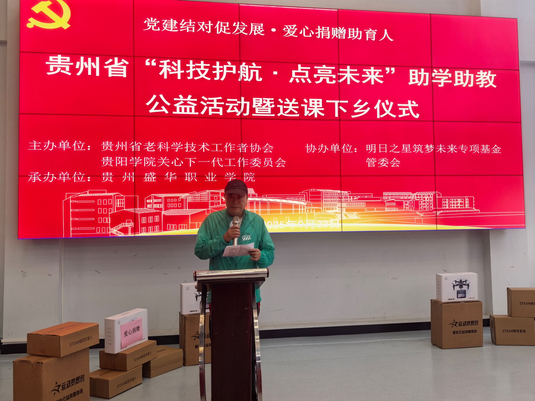 今年3月,我校与贵州盛华职业学院联合制定了《贵阳学院与贵州盛华职业学院党建工作结对共建工作方案》,为充分发挥党建引领作用,凝聚社会爱心力量,推动教育资源均衡发展,9月23日,在贵州省老科学技术工作者协会、贵阳学院关心下一代工作委员会、明日之星筑梦未来专项基金管委会以及中共贵州盛华职业学院委员会的共同策划与组织下,开展了“科技护航˙点亮未来”助学助教公益活动暨送课下乡活动。本次活动旨在通过捐赠科技教育物资、开展送课下乡等形式,为贵州盛华职业学院的教育添砖加瓦,助力同学们成长成才,为教育事业发展贡献一份爱心。