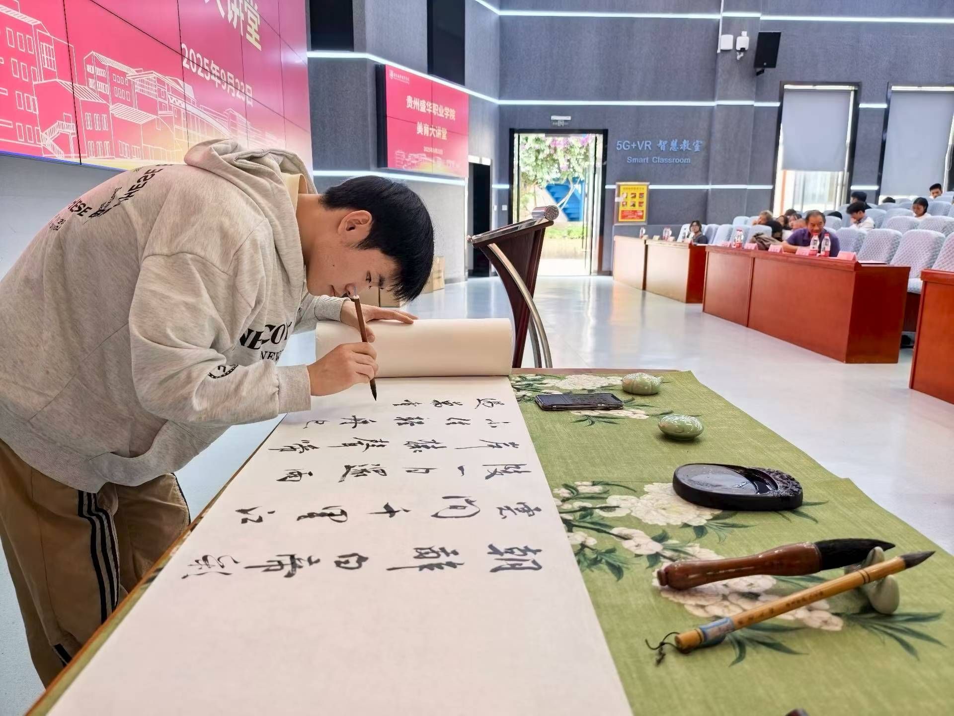 捐赠科技教育物资结束后,贵阳学院关心下一代工作委员会常务副主任周贵发教授为同学们作了美育大讲堂——书法艺术讲座,介绍书法艺术特点和基本技巧,并现场进行书法演示,同时邀请同学们上台体验书法创作,使同学们领略了书法艺术的独特魅力,感受到汉字之美、笔墨之韵。